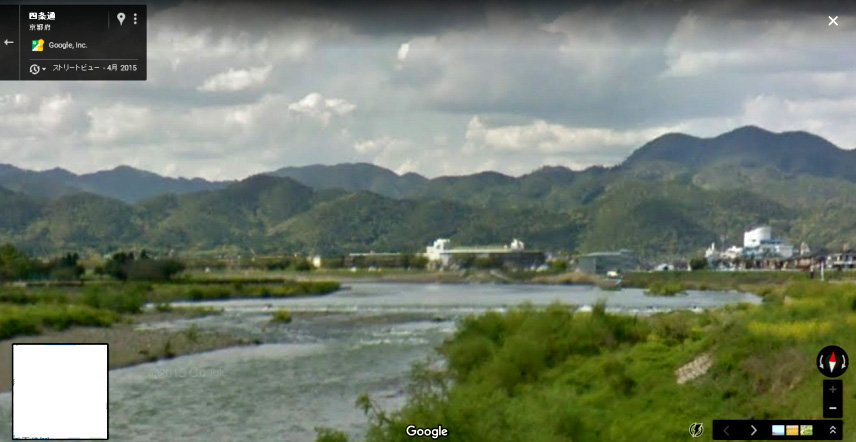 | 京都市西京区嵐山朝月町の松尾橋の上から北方向を見たグーグルのストリートビューの画像。遠景の山並みが一致。 ↓ |