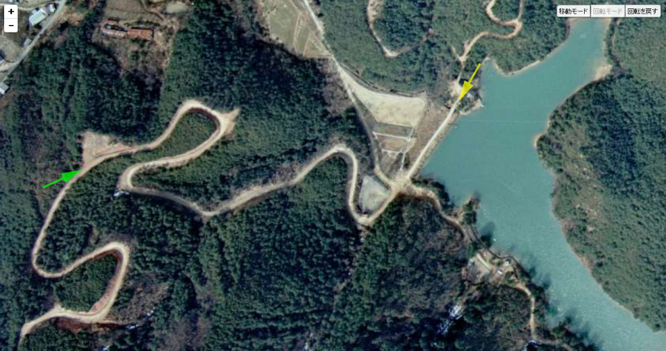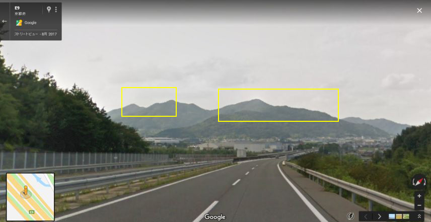 | 現地付近から北西方向を見たグーグルのストリートビューの画像。右の黄枠が画像Dの、左の黄枠が画像Eの山並みと一致。 ↓ |