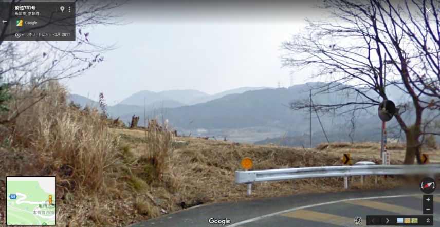 | 上の航空写真の右端あたりから取得したグーグルのストリートビューの画像。遠方の山並みが画像A、画像Bと一致。 (現在の府道両脇にはゴルフ場の並木が茂っており、画像A周辺は見とおしがほとんど利かない。山並みの見える場所は、ここしかなかった。) ↓ |