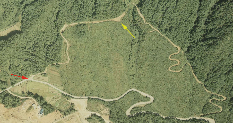 | 国土地理院の「国土変遷アーカイブ」による現地周辺の1975年撮影の航空写真。うねった山道(おそらく旧道)の黄色い矢印にポツンと見える点が、くだんの巨石かと思われる。 ↓ |
