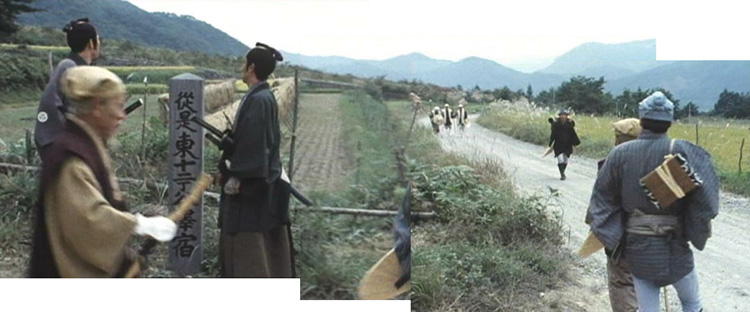 | 街道を行く黄門様。上の航空写真の赤い矢印方向に撮っている。奥へ伸びる道は「京都府道731号線」。山並みに注目。(切り貼り合成画像) ↓ |