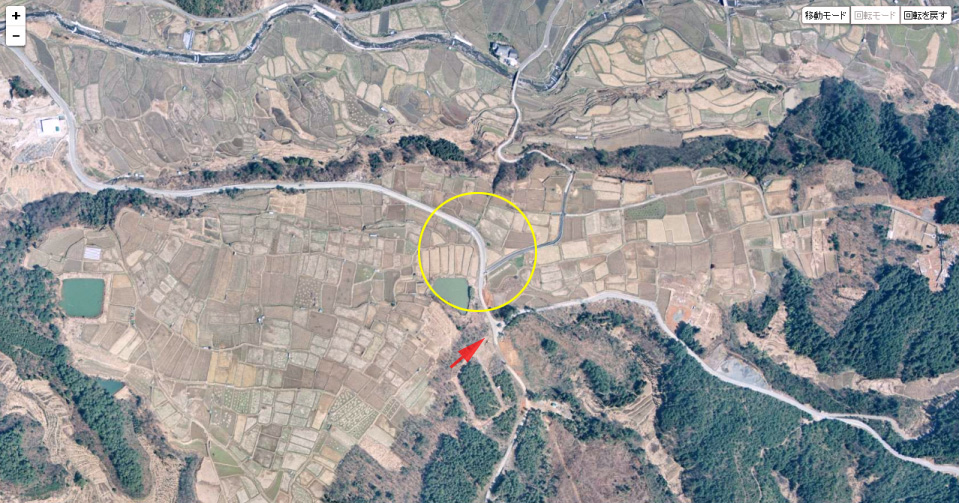 | 国土地理院の「国土変遷アーカイブ」による現地周辺の1975年撮影の航空写真。黄色い円内あたりがロケ地かと思われる。 ↓ |