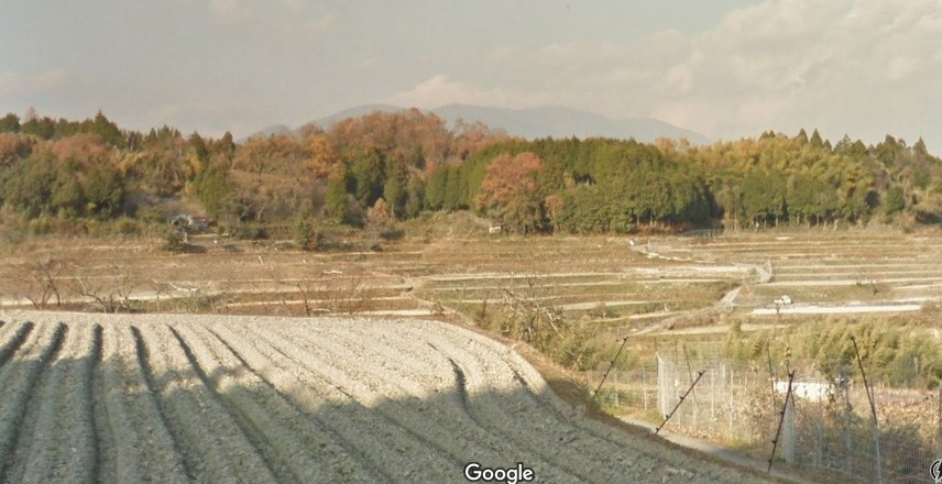 | グーグルのストリートビューの画像。当時より木立ちが茂っているが、山並みが一致。見とおしを考慮したので、本編よりややズレた場所からの画像になっている。 ↓ |