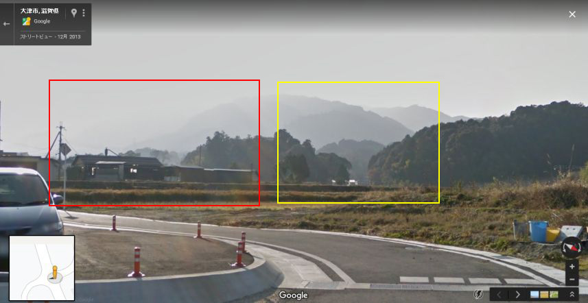 | グーグルのストリートビューの画像。黄色い枠内は画像A・画像Bと、赤い枠内は画像Cと一致。 ↓ |