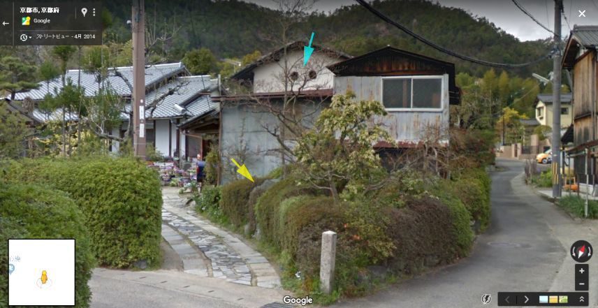 | グーグルのストリートビューの画像。あちこち改築されているが、黄色い矢印の庭石と、水色の矢印の通風孔が一致。 ↓ |