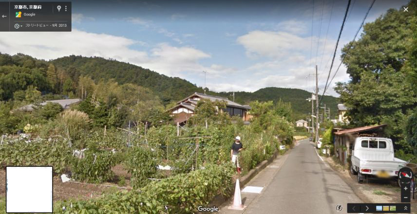 | 民家あたりから東方向を見たグーグルのストリートビューの画像。山並みが一致。 ↓ |