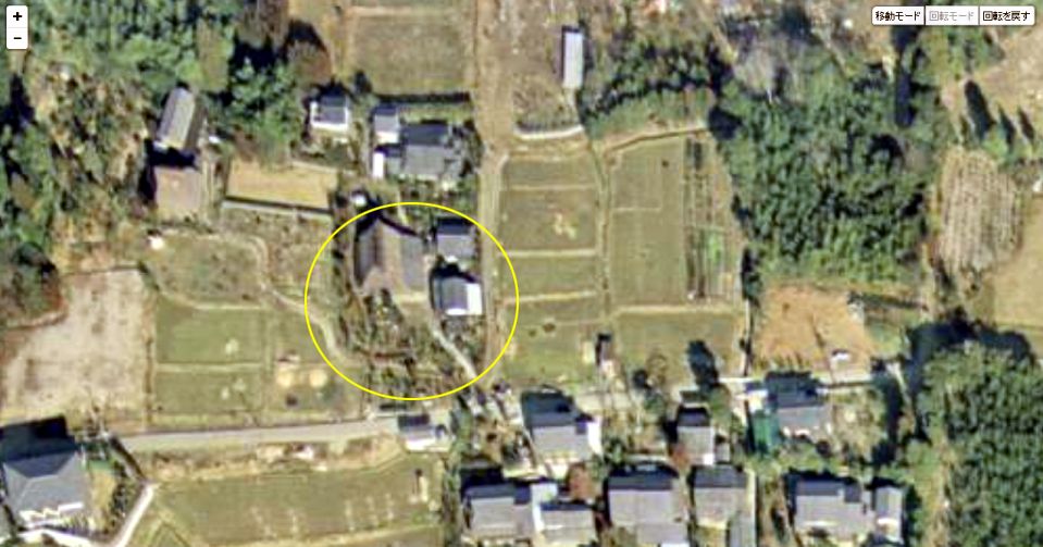 | 国土地理院の「国土変遷アーカイブ」による現地周辺の1975年撮影の航空写真。黄色い円内がロケ地。当時は萱葺屋根だった。 ↓ |