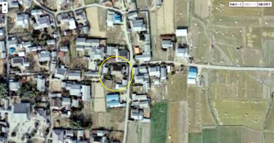 | 国土地理院の「国土変遷アーカイブ」による現地周辺の1975年撮影の航空写真。黄色い円内がロケ地。 ↓ |