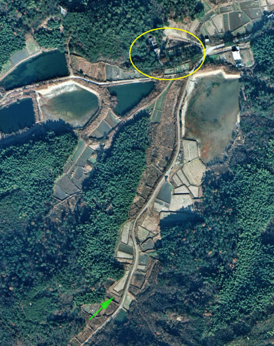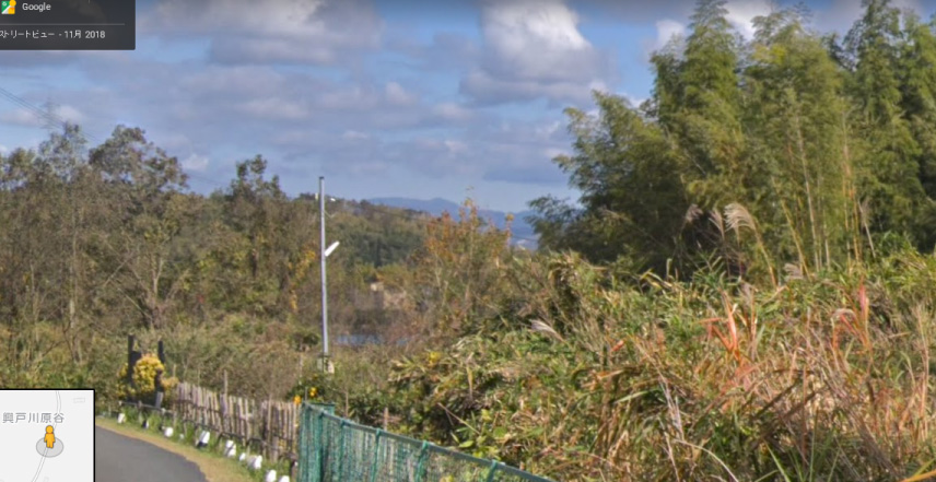 | グーグルのストリートビューの画像。山並みが一致。かすかに水面も見えている。 現地は雑草・雑木伸び放題で非常に見とおしが悪く、遠方の山並みの見える場所がここしか無かった。 ↓ |