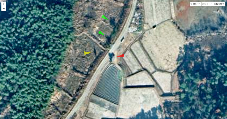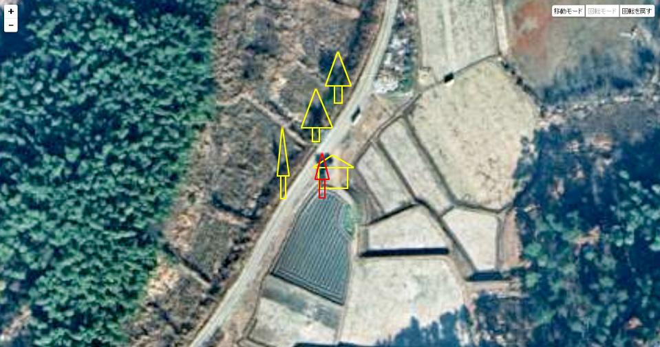 | 大雑把な位置関係を描き込んでみた。赤い木は小屋の南側にある。 ↓ |