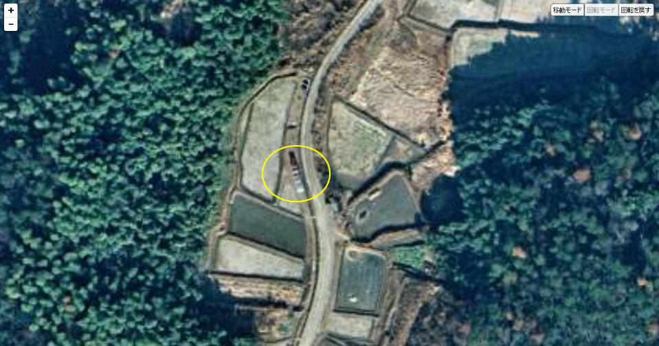 | 上記の赤い枠内を拡大したもの。黄色い円内に見えるのが稲木小屋。−2019/10/23追加− ↓ |
