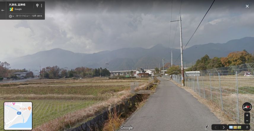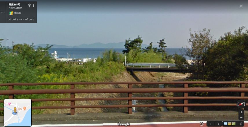 | 橋のやや西から取得したグーグルのストリートビューの画像。山並みが一致していると思う。 ↓ |