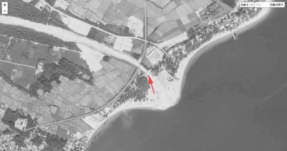 | 国土地理院の「国土変遷アーカイブ」による現地周辺の1968年撮影の航空写真。赤い矢印がロケ推定地。 ↓ |