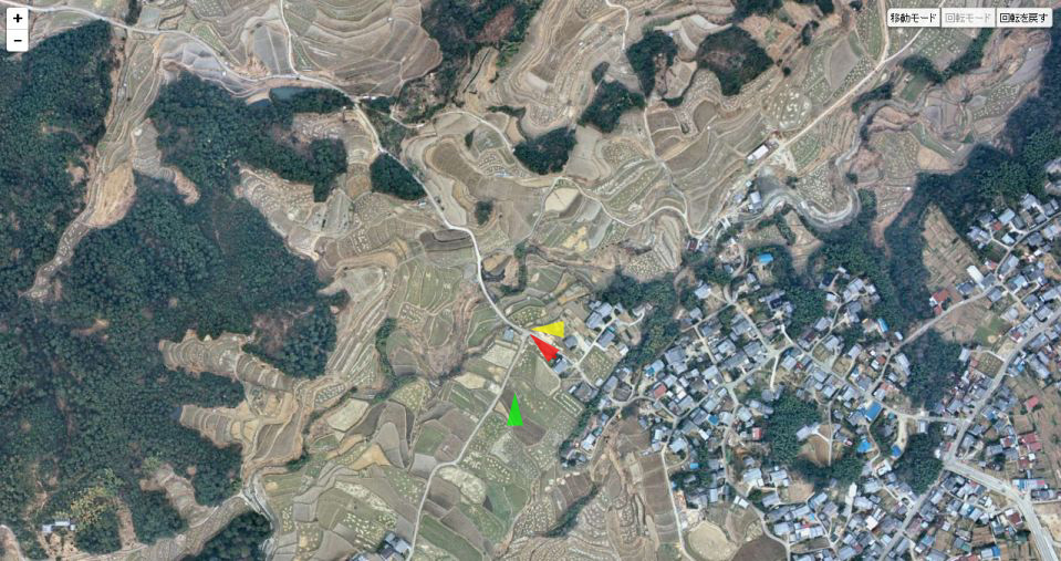 | 国土地理院の「国土変遷アーカイブ」による現地周辺の1975年撮影の航空写真。 黄色い矢印−画像A 赤い矢印−画像B 黄緑の矢印−画像C である。 ↓ |