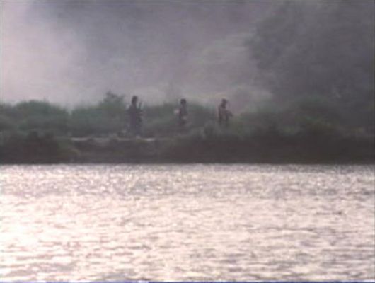 | このシーン。スモークを焚いているものの、奥に細長い木と2本のもじゃっとした木がしっかり見える。 ↓ |