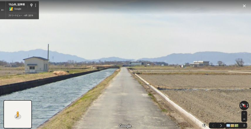 | 現地から取得したグーグルのストリートビューの画像。山並みが一致。ロケ地はここよりもう少し南東あたりかと思われるが、そちらには逆光のひどい画像しか無かったのでこちらで代用した。なお画像の水路は、本編の水路とは異なると思う。 ↓ |