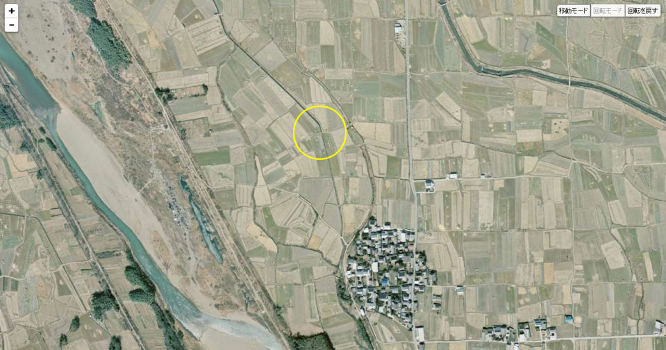 | 国土地理院の「国土変遷アーカイブ」による1975年撮影の航空写真。黄色の円内がロケ地だと思われる。 ↓ |