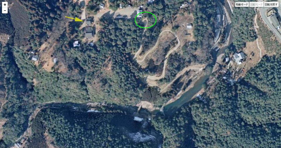 | 国土地理院の「国土変遷アーカイブ」による現地周辺の1975年撮影の航空写真。黄色い矢印が五大堂、緑の円内が関所である。 ↓ |