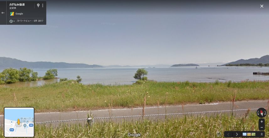 | グーグルのストリートビューの画像。ロケ地はもう少し東寄りかと思われるが、湖岸の並木が邪魔をして画像が取得できなかった。 ↓ |