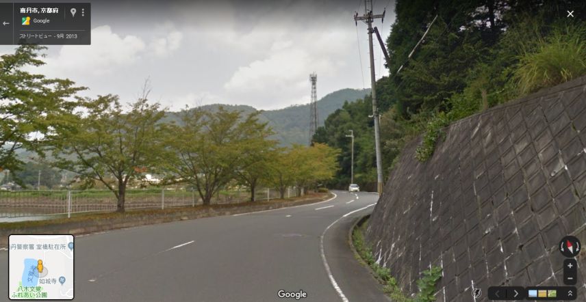 | グーグルのストリートビューの画像。ロケ場所はもう少し奥なのだが、そこからは茂った木立ちで遠方の山が見えなかった。 ↓ |