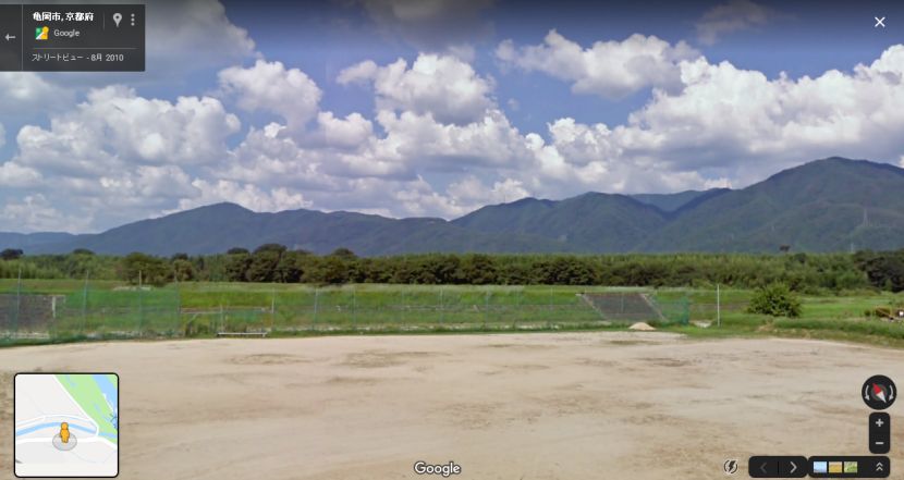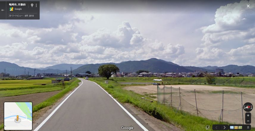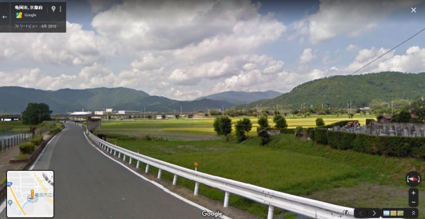 | 上と同じ場所から取得したグーグルのストリートビューの画像。山並みが一致。今は見当たらないが、当時は現地にこういう橋があったのであろう。 ↓ |