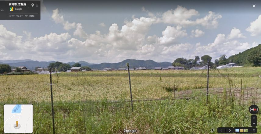 | 現地のやや南から取得したグーグルのストリートビューの画像。本編左に見える山並みは、画面中央の物かと思われる。 ↓ |