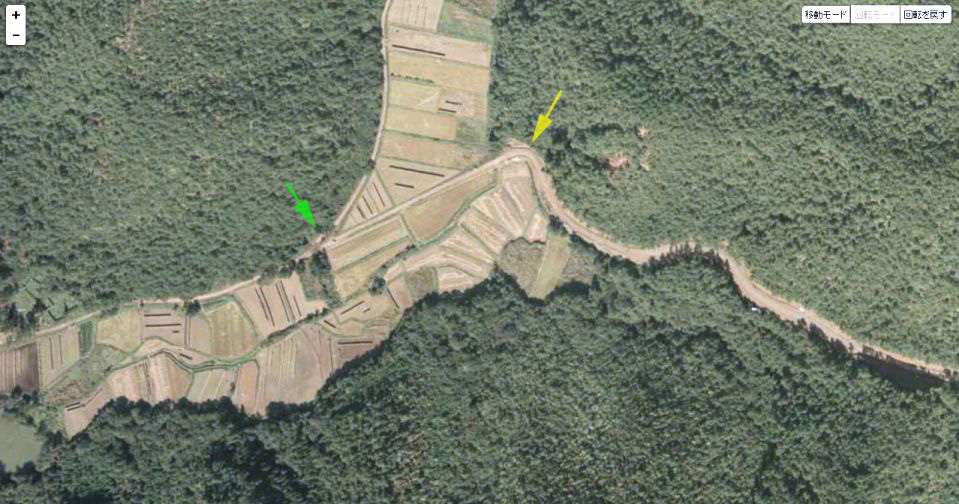 | 国土地理院の「国土変遷アーカイブ」による1975年撮影の航空写真。田んぼの形状から考えて、上のシーンは黄色い矢印方向に撮ったと思われる。緑の矢印は例のお堂。 ↓ |