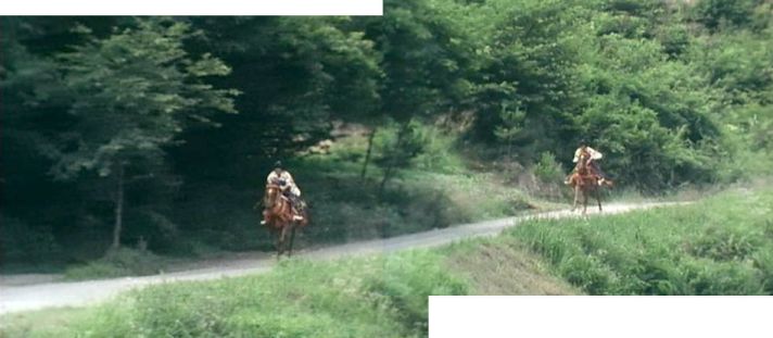 | 騎乗シーン。左端のヒョロ長い木と、中央の2本の細い木に注目。(切り貼り合成画像) ↓ |
