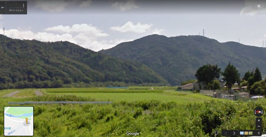 | 亀岡市保津町十八ノ坪の橋から取得したグーグルのストリートビューの画像。奥の谷間は保津峡の入口。 ↓ |