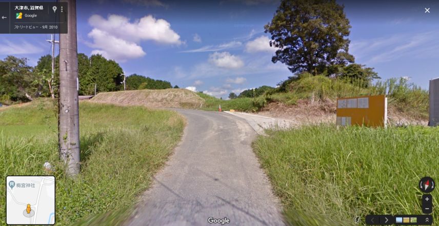 仰木町の梅宮神社のやや南から取得したグーグルのストリートビューの画像。右手は工事中の道路。