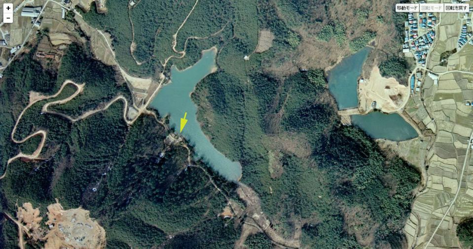 | 国土地理院の「国土変遷アーカイブ」による1975年撮影の航空写真。黄色い矢印あたりにある東屋が本編に映っているらしい。(「ビジュアルばあさん」さん談) ↓ |