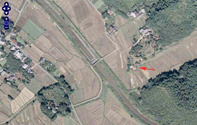 | 国土地理院の「国土変遷アーカイブ」による1975年撮影の航空写真。赤い矢印の萱葺屋根の民家で撮っていると思われる。 ↓ |