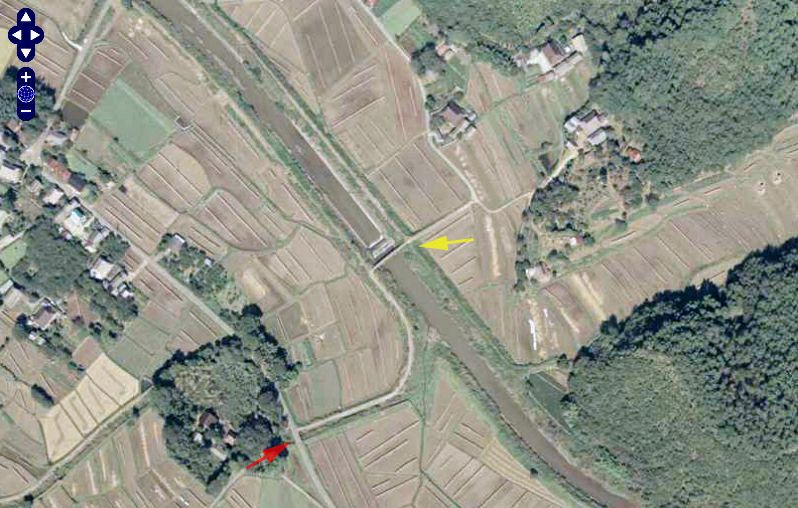 | 国土地理院の「国土変遷アーカイブ」による現地周辺の1975年撮影の航空写真。画像Aは赤い矢印、画像Bは黄色い矢印方向に撮っている。 ↓ |