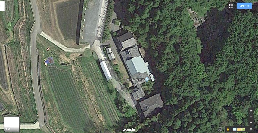 | グーグルの空中写真の画像。お堂が1つ増えている。個人撮影画像によると、西側の道路沿いに石垣がある。 ↓ |