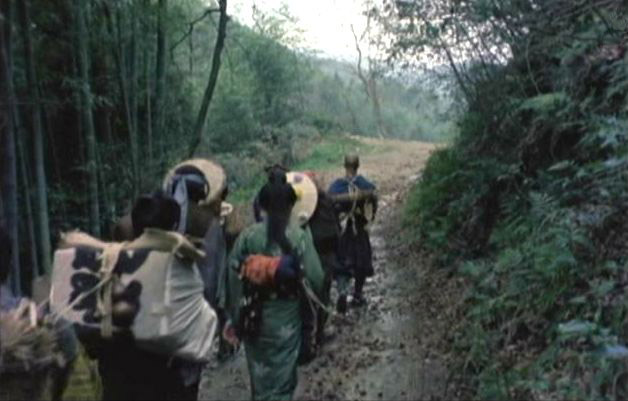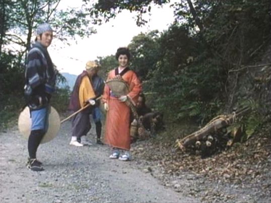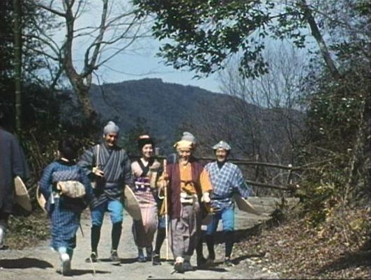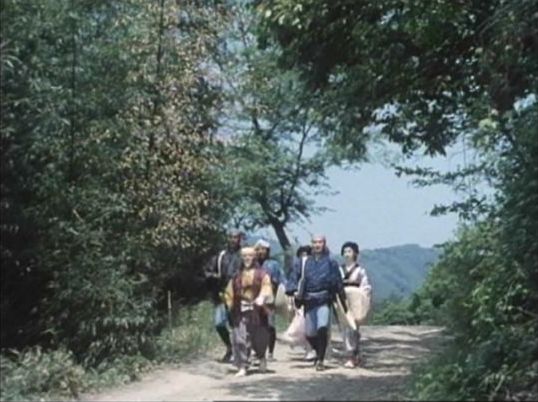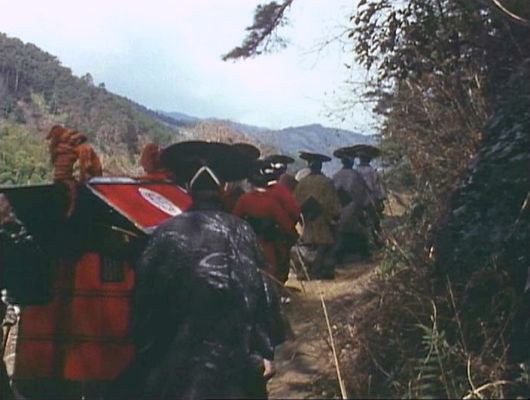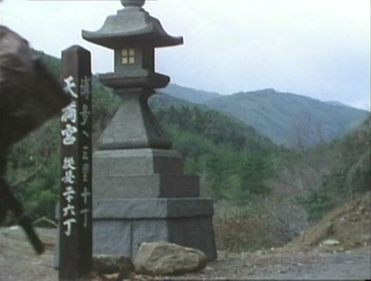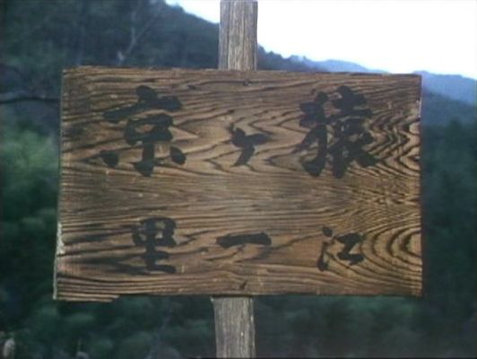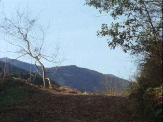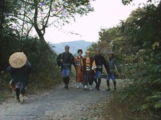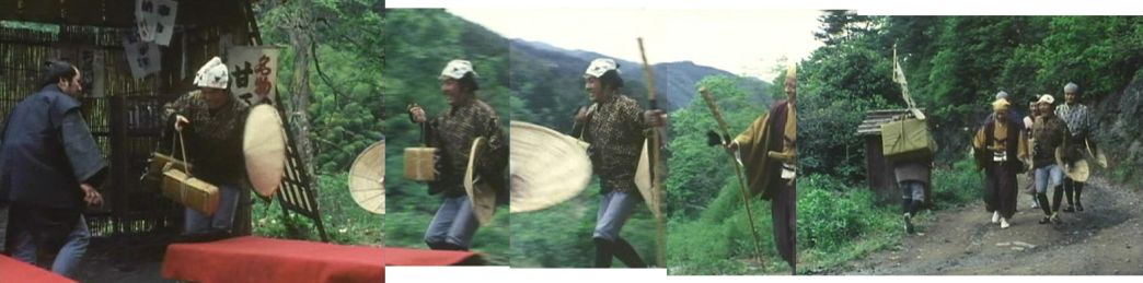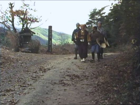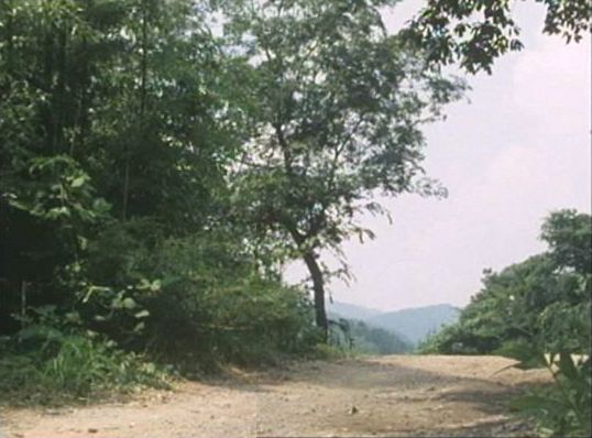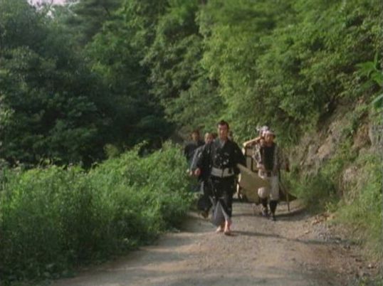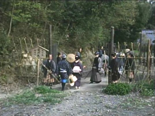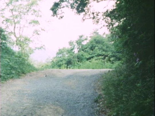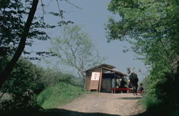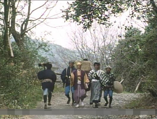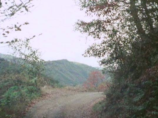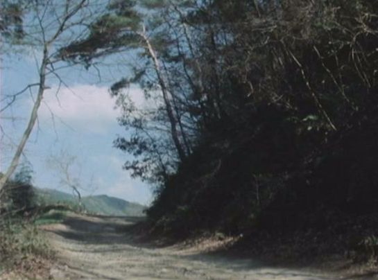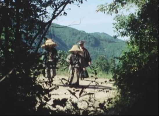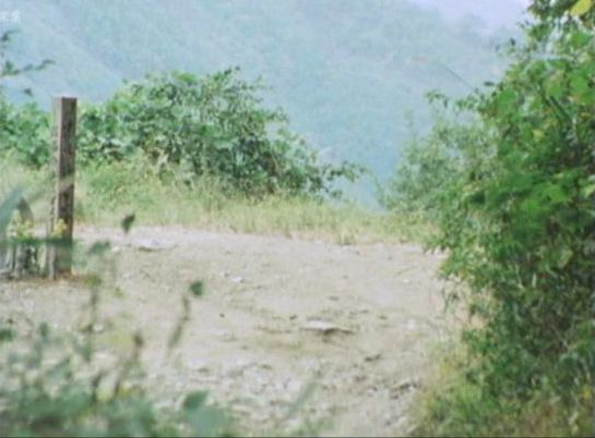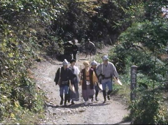 | 上のシーンの次に一行が山道を歩くシーンがあり、その次のシーンがこれ。同じ道の奥だと思う。山並みに注目。この回には有栖川の河原でのロケがある。 ↓ |
