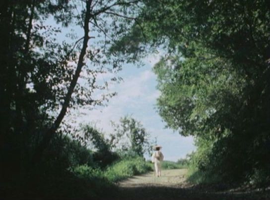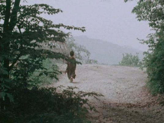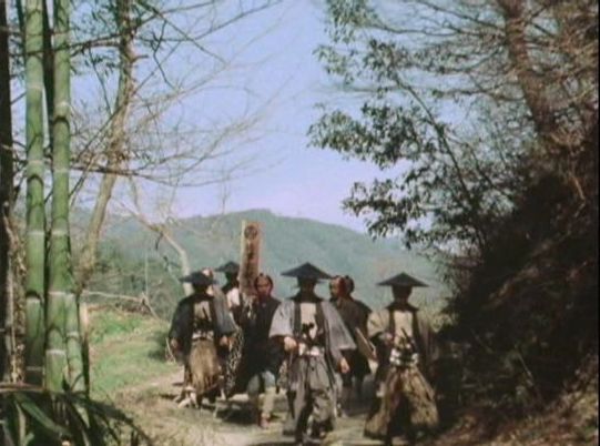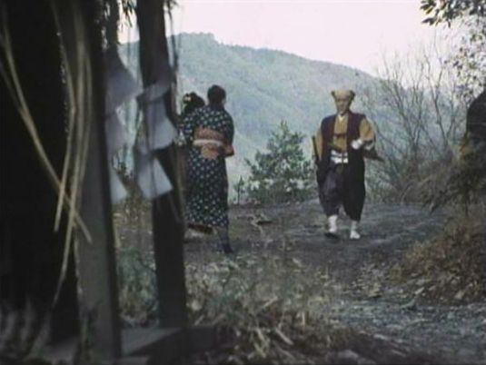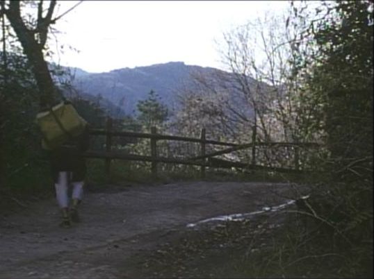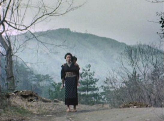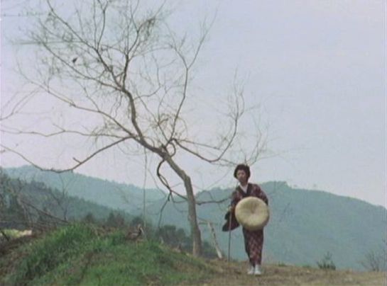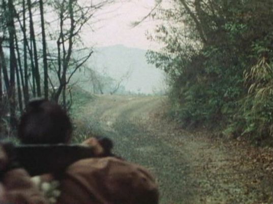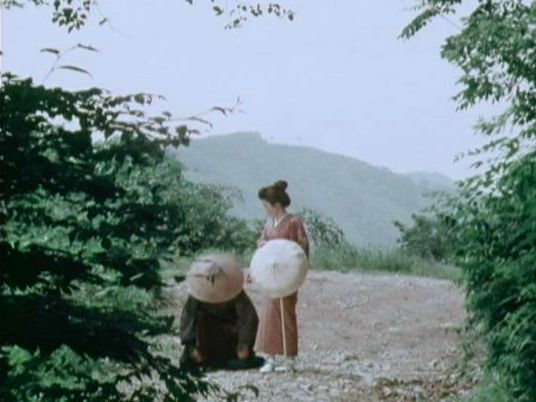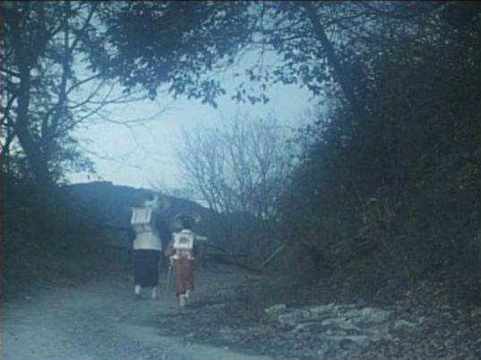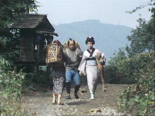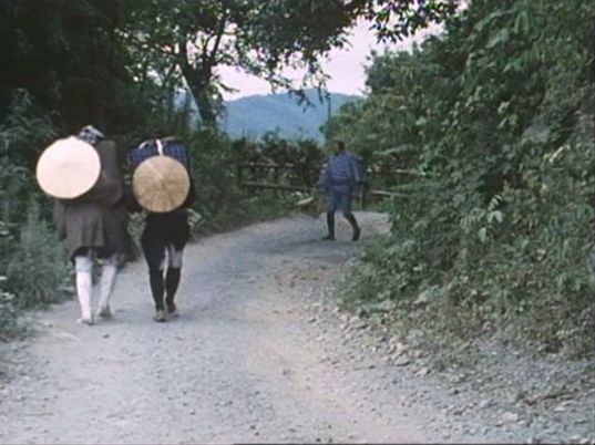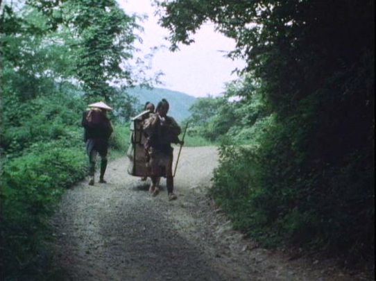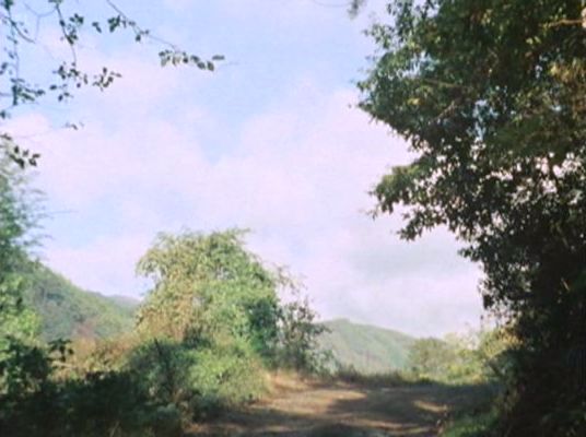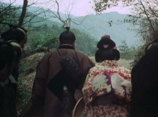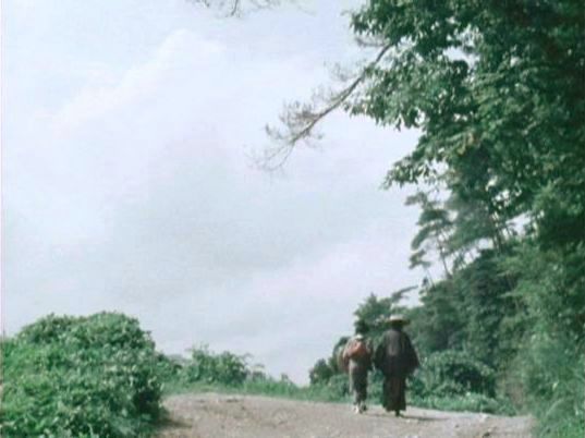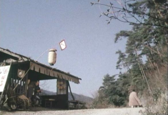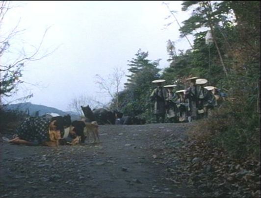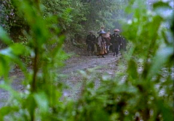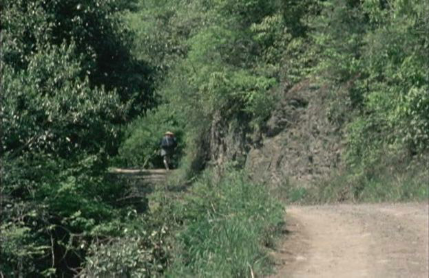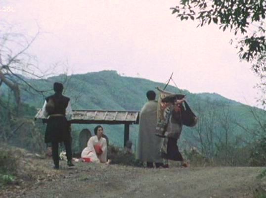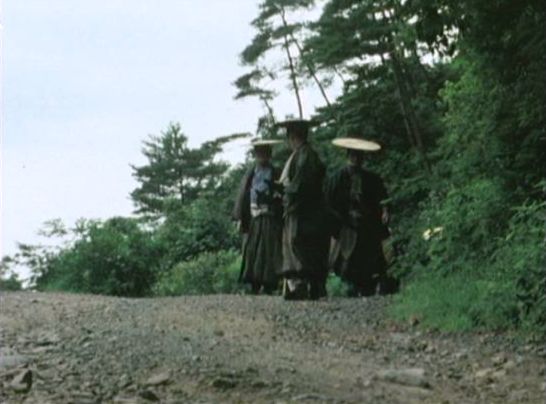 | 上のシーンの次に一行が山道を歩くシーンがあり、その次のシーンがこれ。同じ道の奥だと思う。山並みに注目。この回には有栖川の河原でのロケがある。 ↓ |