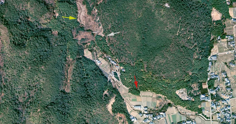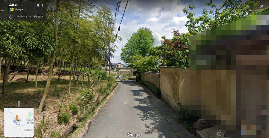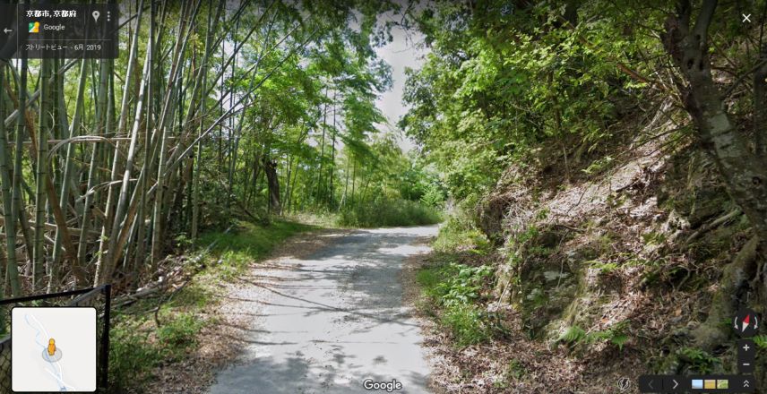 | 画像Aの場所から取得したグーグルのストリートビューの画像。当時は左右とも竹林だったようだが、現在右手は民家となっている。 ↓ |