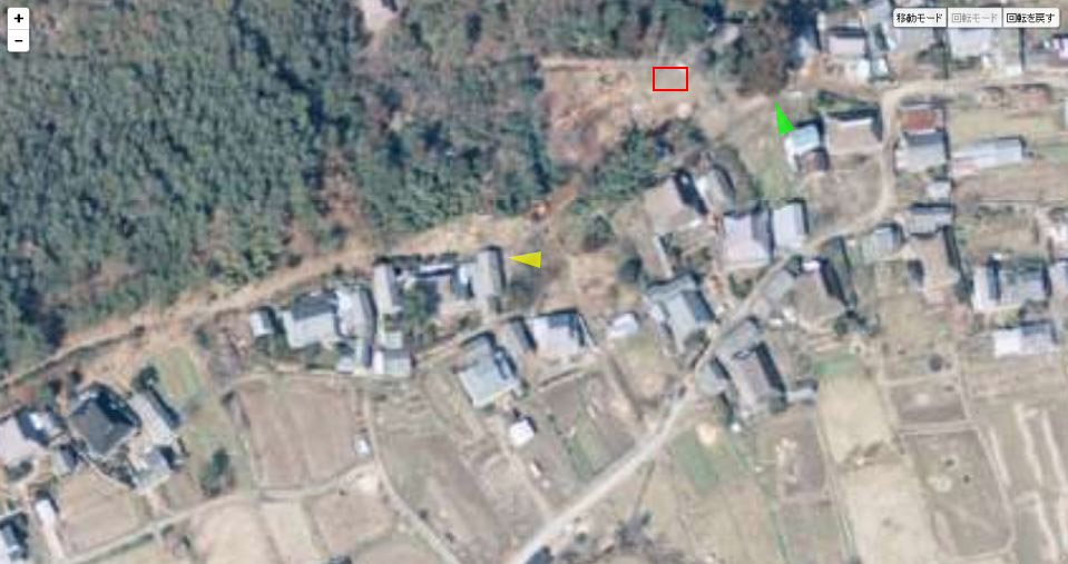 | 国土地理院の「国土変遷アーカイブ」による1975年撮影の航空写真。黄色い矢印が土蔵、赤い四角が小屋のセット、緑の矢印が大内神社。 ↓ |