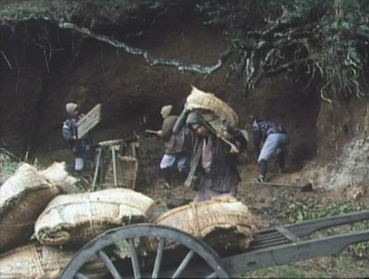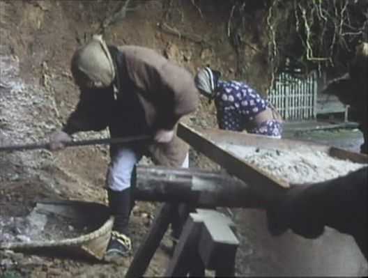 | 地の粉(じのこ)の原料の土を採掘する小峰山のシーン。右手に映っている柵が大内神社の社殿の物に酷似しているので、神社の隣りで撮ったと思われる。 ↓ |