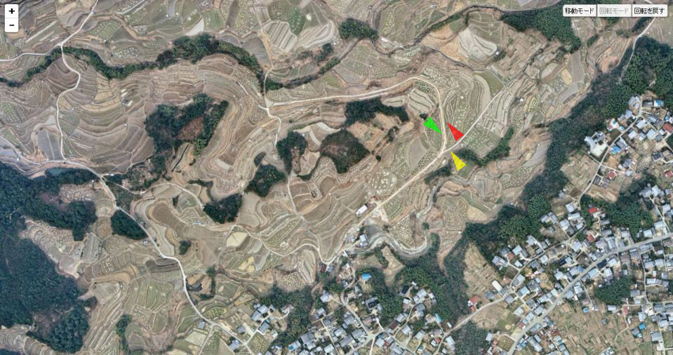 | 国土地理院の「国土変遷アーカイブ」による1975年撮影の航空写真。赤い矢印が画像A、黄色い矢印が画像B、緑の矢印が画像Cの撮影方向。 ↓ |