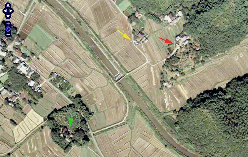 | 国土地理院の「国土変遷アーカイブ」による1975年撮影の航空写真。赤い矢印が画像A、黄色い矢印が画像B、緑の矢印が薮田神社。 ↓ |