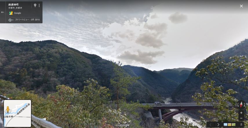| グーグルのストリートビューの画像。眼下に見えるのはJR保津峡駅。本編のカメラが若干傾いているので、山並みがしっくりこない。 ↓ |