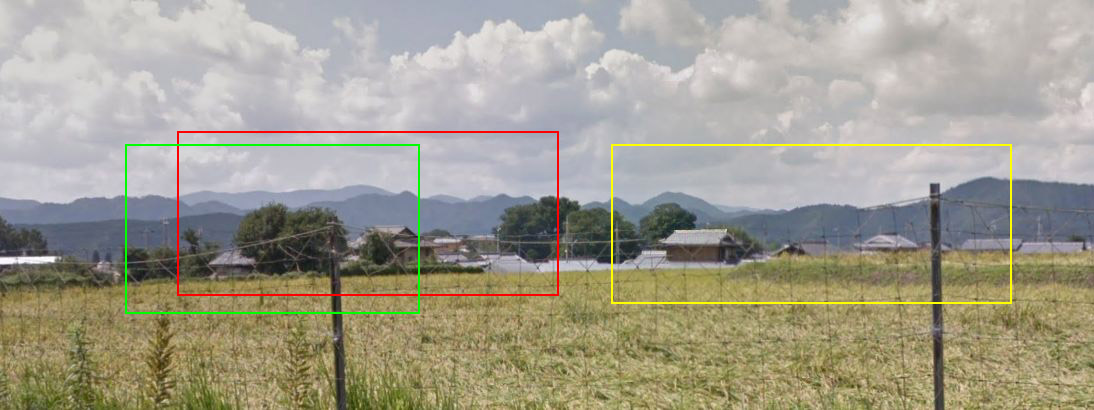 | 現地のやや南から取得したグーグルのストリートビューの画像。黄色い枠が画像B、赤い枠が画像C、緑の枠が画像Dに見える山並みである。 ↓ |