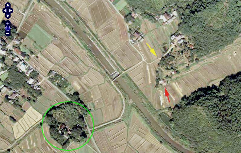 | 国土地理院の「国土変遷アーカイブ」による1975年撮影の航空写真。赤い矢印が萱葺民家。母屋の横に接した小屋のような物が見える。画像AとBは黄色い矢印方向に撮っている。緑の円内は薮田神社。 ↓ |
