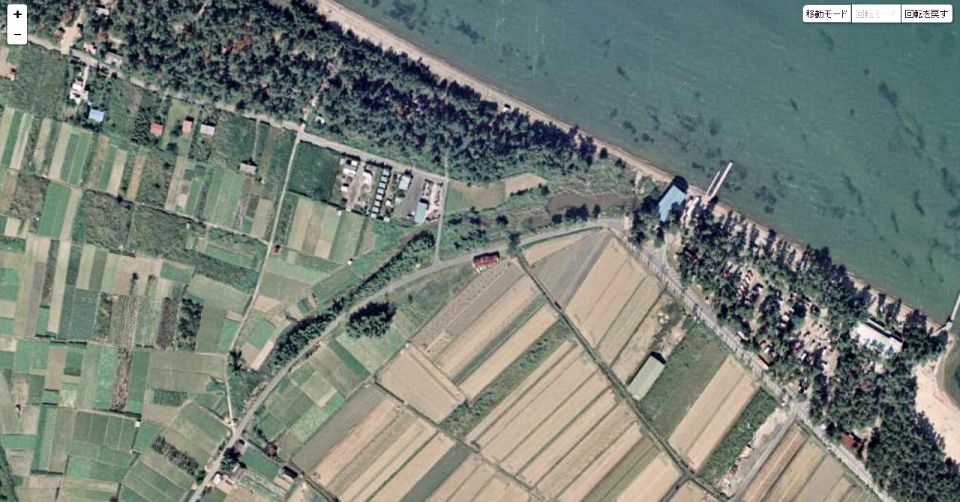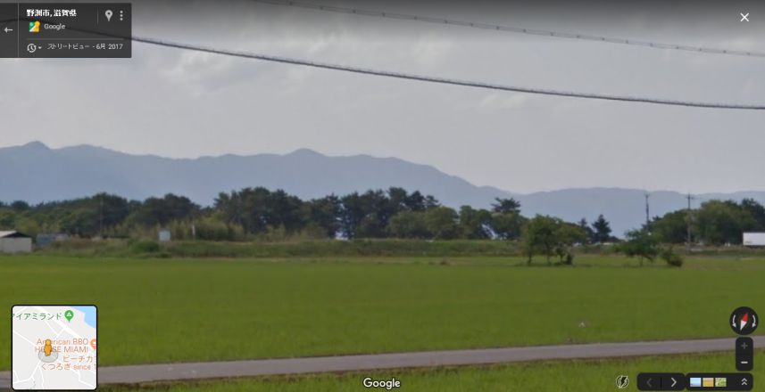 | 現地は並木が邪魔をして見通しが悪かったため、やや内陸の田んぼから取得したグーグルのストリートビューの画像。 ↓ |