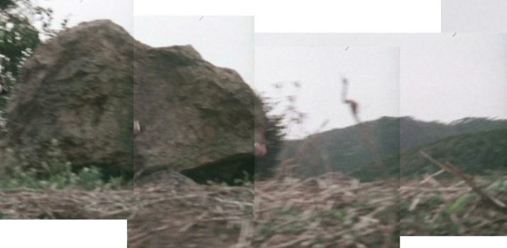 | このシーン。おそらく同地にある「嵯峨七ツ塚古墳」がロケ地。右手に古墳の石材らしき岩が見える。 ↓ |