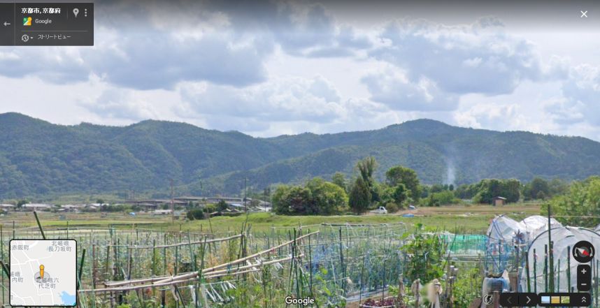 | グーグルのストリートビューの画像。中央の木立ちが「嵯峨七ツ塚古墳」。 ↓ |
