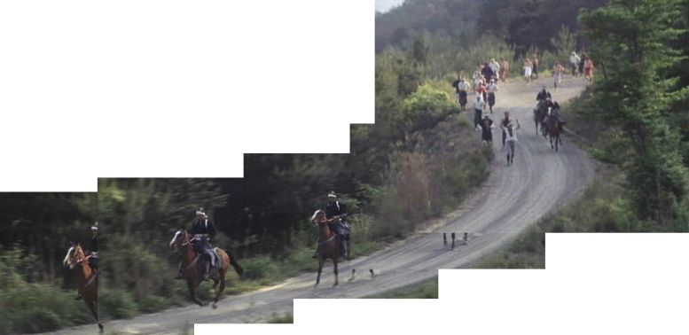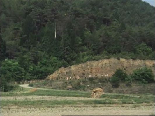 このシーン。奥の路肩によく茶店をしつらえている場所。(切り貼り合成画像)