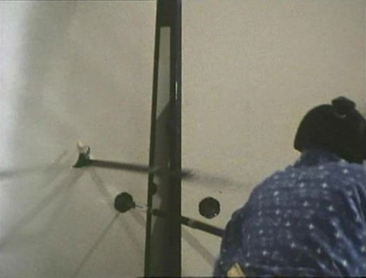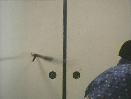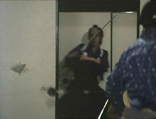 槍は引手で止まったのに、なぜが倒れこんでしまう家中の侍。