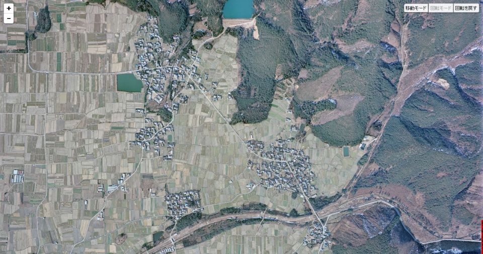 | 国土地理院の「国土変遷アーカイブ」による現地周辺の1975年撮影の航空写真。中央の農道から南東方向を見ていると思われる。民家の映り込みは、左右の木で上手く隠している。「狙われた弥七」の前後回ではここの近隣でロケがあるので、ついでに撮った画像ではなかろうか? ↓ |